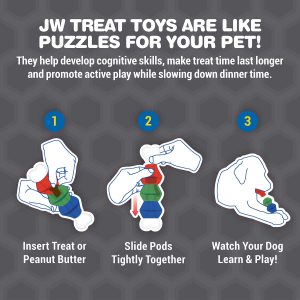 Dogs will enjoy quiet, playful learning with the JW® Pet EverTuff Nylon Treat Pod. This unique toy allows a dog to manipulate and slide the pods to release the treats! Three durable TPR Treat Pods can be filled with a dog’s favorite treats or used as a toy. The Treat Pods are perfect for self-play and can help curb destructive behavior by providing rewards based on play with this interactive chew toy. The chicken-flavored durable nylon bone provides added chewing enjoyment. Dog-tested for long-term play!Available in two sizes, small and large, to accommodate a dog’s chew time needs.