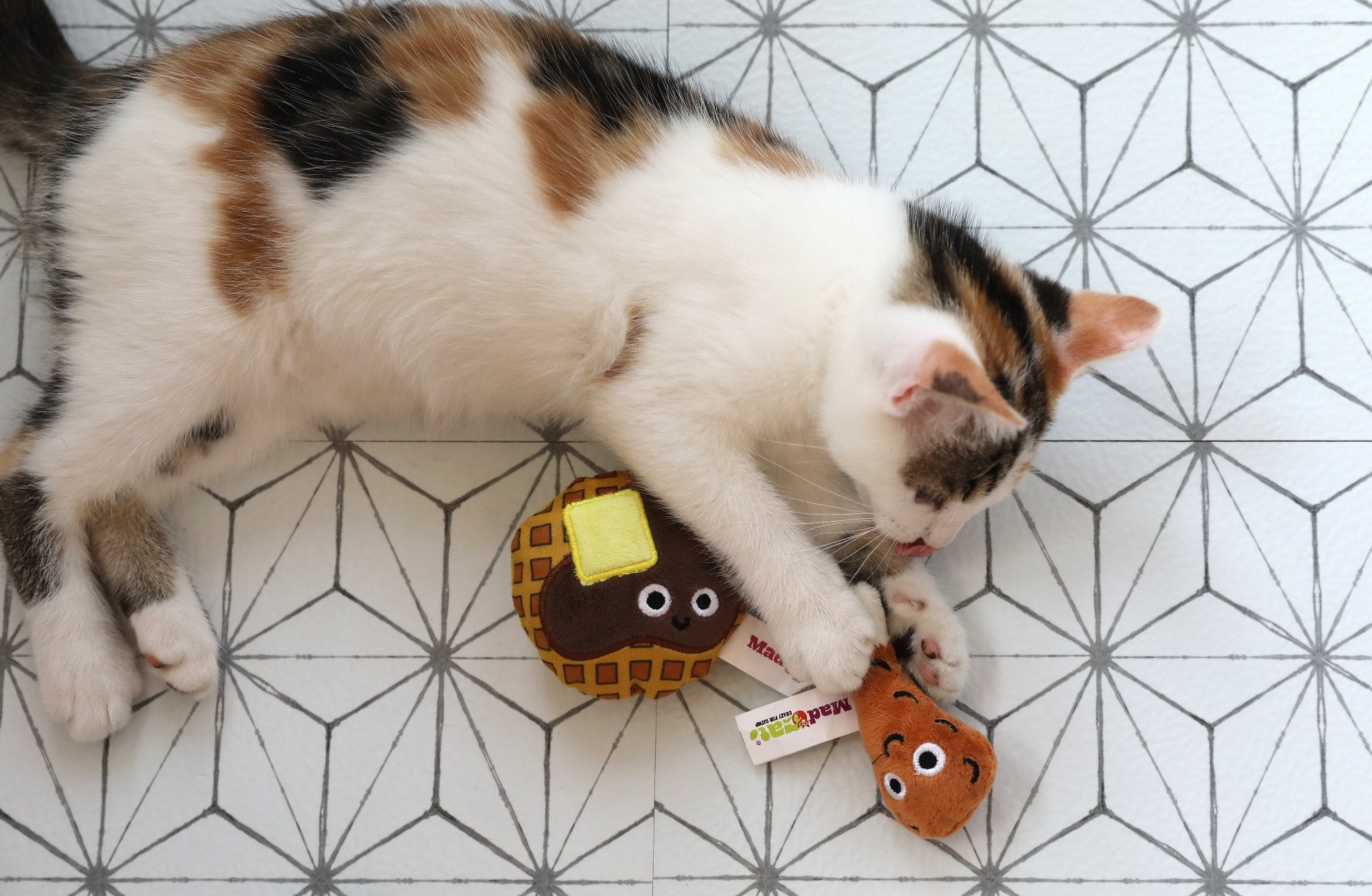 Did someone say brunch? Cats love this brunch classic Mad Cat® Chicken and Waffles Two-Pack. Filled with an irresistible custom blend of catnip and silvervine for twice the cat attractants, plus playful crinkle, this is one menu item a cat won�t say no to. Two unique toys for twice the fun. Silvervine is an all-natural catnip alternative that cats love, it elicits a similar reaction to catnip and works for many cats who normally are not affected by catnip. Some cats LOVE catnip, but not all cats are affected by it. To solve this problem we developed our unique blend of catnip and silvervine. Silvervine is a non-toxic, all-natural catnip alternative that many cats prefer. This potent stimulant elicits a similar reaction to catnip and is pure and pesticide-free. They were made of soft, high-quality plush with multiple textures. Great for tossing, batting, kicking, and cuddling.