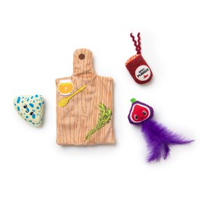 Let’s get cheesy with the new Quirky Kitty® Charcuterie Board Play Mat with four adorable soft plush toys! This fun toy 4-pack includes a crinkly cutting board play mat, a cute cheese wedge, a fuzzy fig, and a sassy salami toy! It is filled with potent, pesticide-free North American-grown catnip that attracts cats to play.